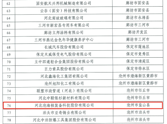 近日,河北省質量強省戰略領導小組發布通知,河北滄海核裝備科技股份有限公司入選河北省質量強省建設領軍企業培育名單,這也是滄海核裝獲得政府質量獎后獲得的又一質量建設領域的榮譽資質。