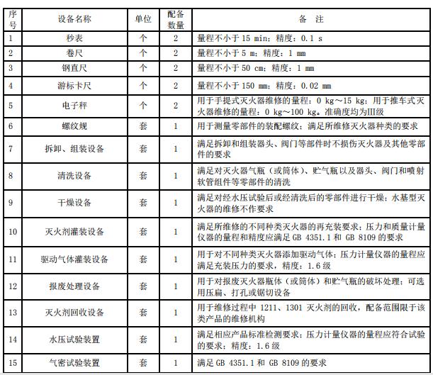 三級消防設施維護保養中山檢測設備用于滅火器的檢查、維修、更換滅火劑及回收,其設備配備的種類和數量至少應滿足表 3 的要求。